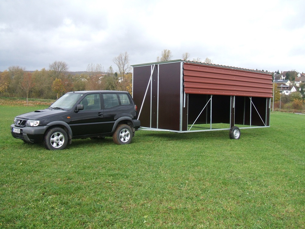 Unsere Weidehütten sind je nach Ausführung bis zu einer Größe von ca. 8 × 3 m sicher auf Straße und Weide fahrbar.